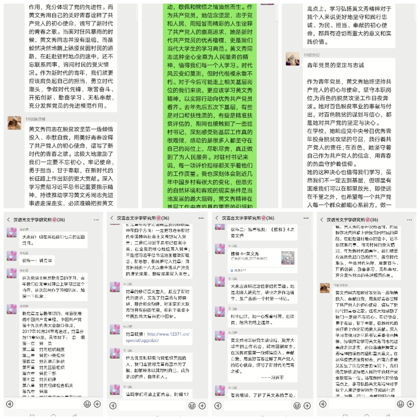 活动观看了视频《榜样》4黄文秀节选,并结合党章和黄文秀精神谈自身感想。海啸同志提到:“当面对狂风暴雨的时候,黄文秀同志并没有退缩,而是毅然决然地踏上驰援贫困村民的道路。作为新时代的青年,我们更应肩负起自己的担当,勇立时代潮头,争做时代先锋,艰苦奋斗、开拓创新、勤奋学习、无私奉献,充分发挥党员的先进模范作用。”刘婷同志说:“黄文秀的这种决心值得我们学习,虽然我们不一定去到基层,但哪里有困难我们可以在那里放光,即使远在千里之外,也希望每一个共产党人每一个群众都能心系前方,做一些力所能及的事情。”张福英同志说:“最开始看到黄文秀的事迹就深受触动,敬佩和惋惜之情油然而生。对于今后可能走上相关基层岗位的我们来说,更应该学习黄文秀精神,以实际行动向优秀共产党员看齐。”阎然同志说:“黄文秀放弃大城市的工作机会,毅然回到家乡,在脱贫攻坚第一线倾情投入、奉献自我,用美好青春诠释了共产党人的初心使命,谱写了新时代的青春之歌。体现了新时代青年的责任与担当,我们要像她学习,不忘初心、勇于担当、甘于奉献,坚守使命,告诉我们不论在哪里都要发挥党员的先锋模范作用。”郑然同志提到,“作为新时代的青年,黄文秀同志在扶贫工作上,身体力行,不忘初心,她是脱贫攻坚的践行者。做为一名共产党员,我们要像黄文秀同志一样,要主动响应国家和社会的需要,敢于走出舒适圈,要撸起袖子加油干,磨练意志,不怕风雨,能担当、敢担当,勇于担当,这样才能不辱使命。”