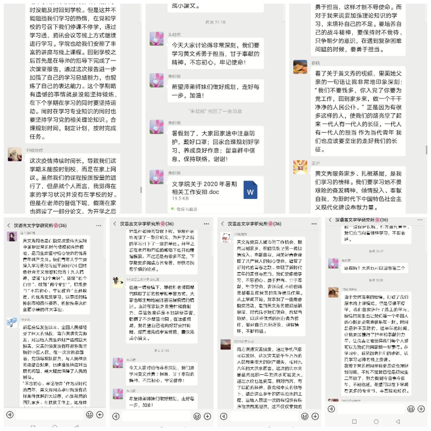 在学习优秀共产党员黄文秀事迹后,支部成员总结了这一学期在生活、学习和工作中的收获和不足,并对新的学期充满了期待,对下一学期的任务有了初步规划。