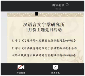 1月10日晚,汉语言文字学研究所党支部在腾讯会议开展以学习《习近平给人民教育出版社老同志的回信》和《中共教育党组关于贯彻习近平总书记给人民教育出版社老同志重要回信精神的通知》为主题的党日活动。会议由支部副书记海啸主持,汉语言文字学全体党员、积极分子参加此次会议。